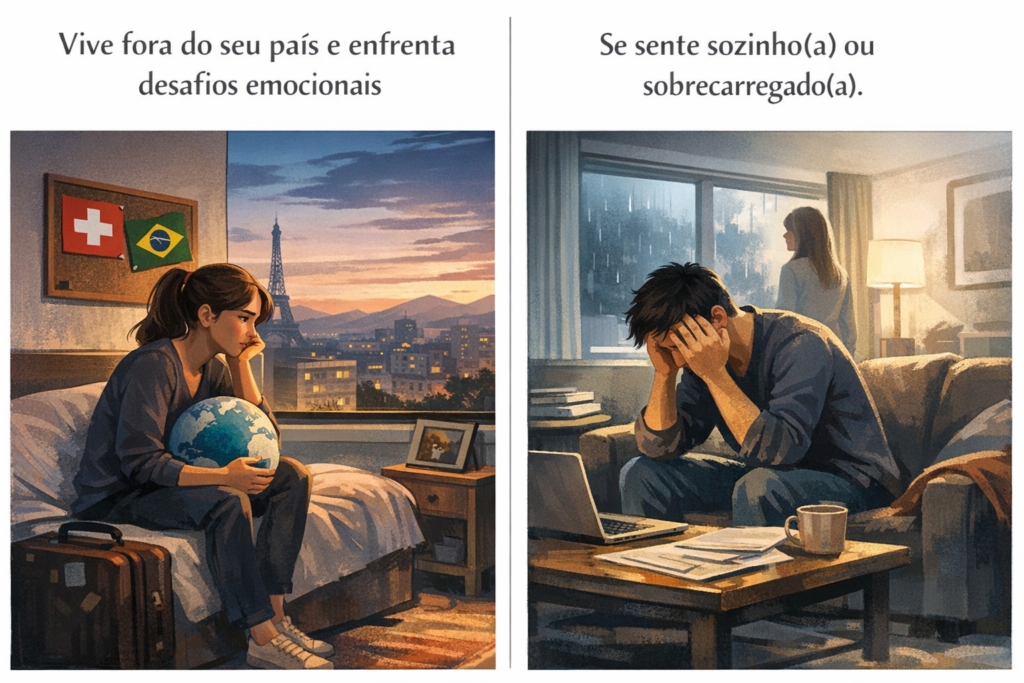 Atendimento psicológico em português e espanhol para pessoas que vivem fora do seu país, enfrentando ansiedade, adaptação e desafios emocionais.